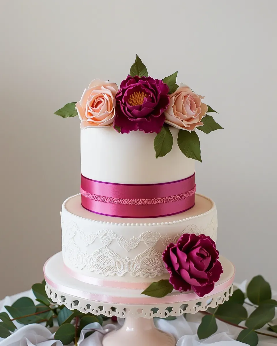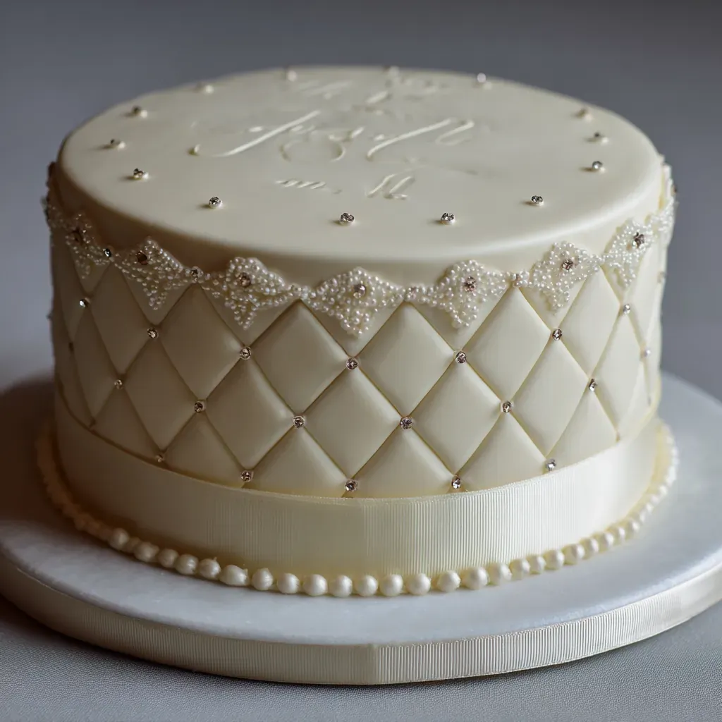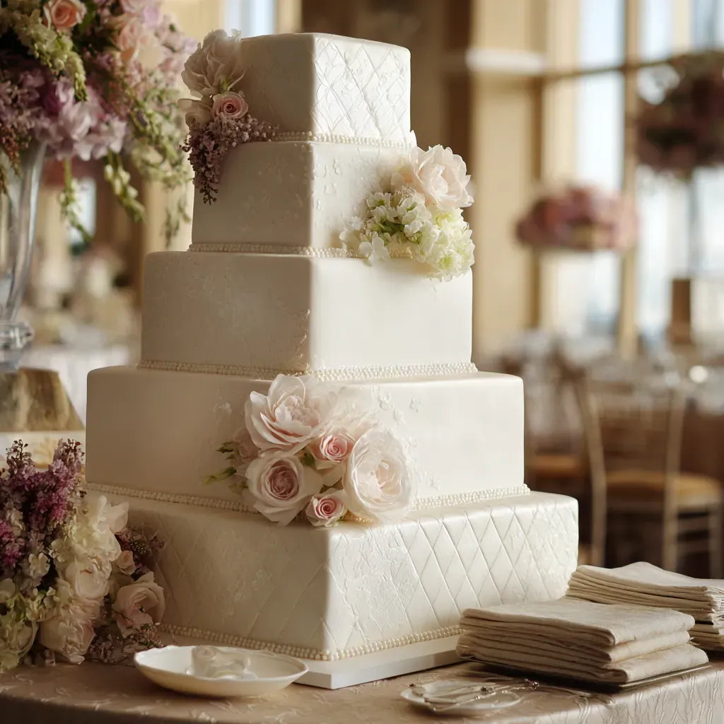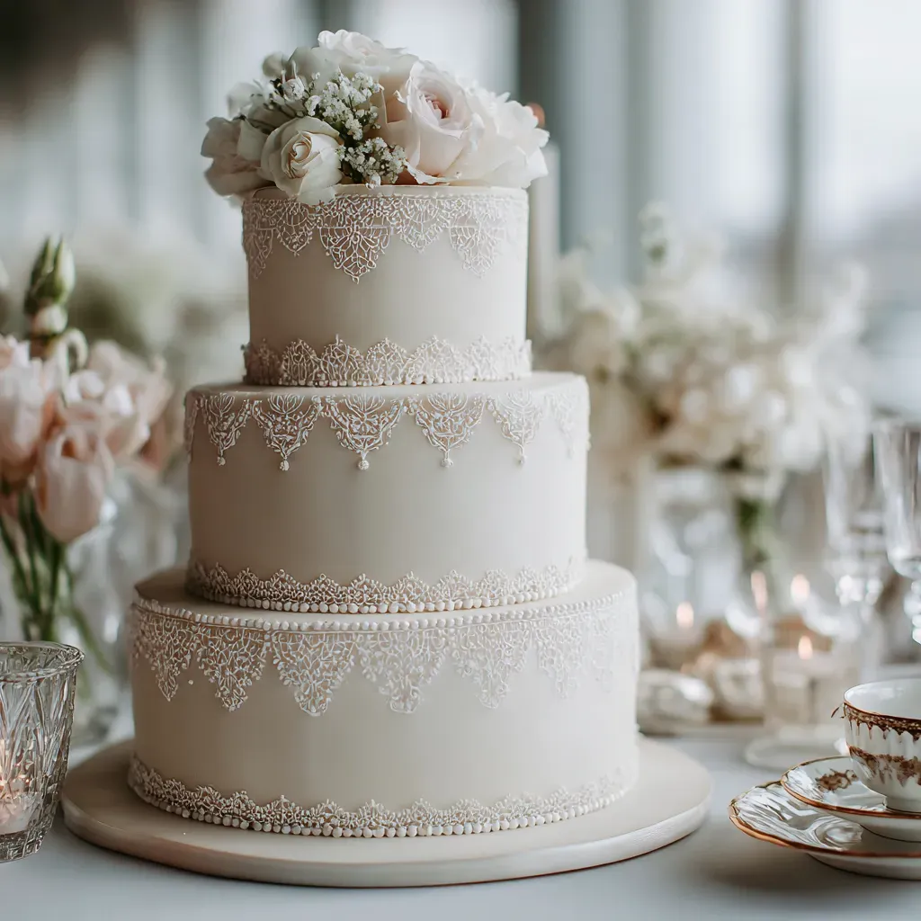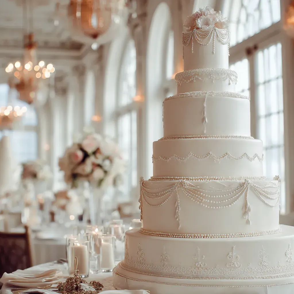Proper elegant tiers, sporting royal icing, delicate lace, and quilted or draped patterns.