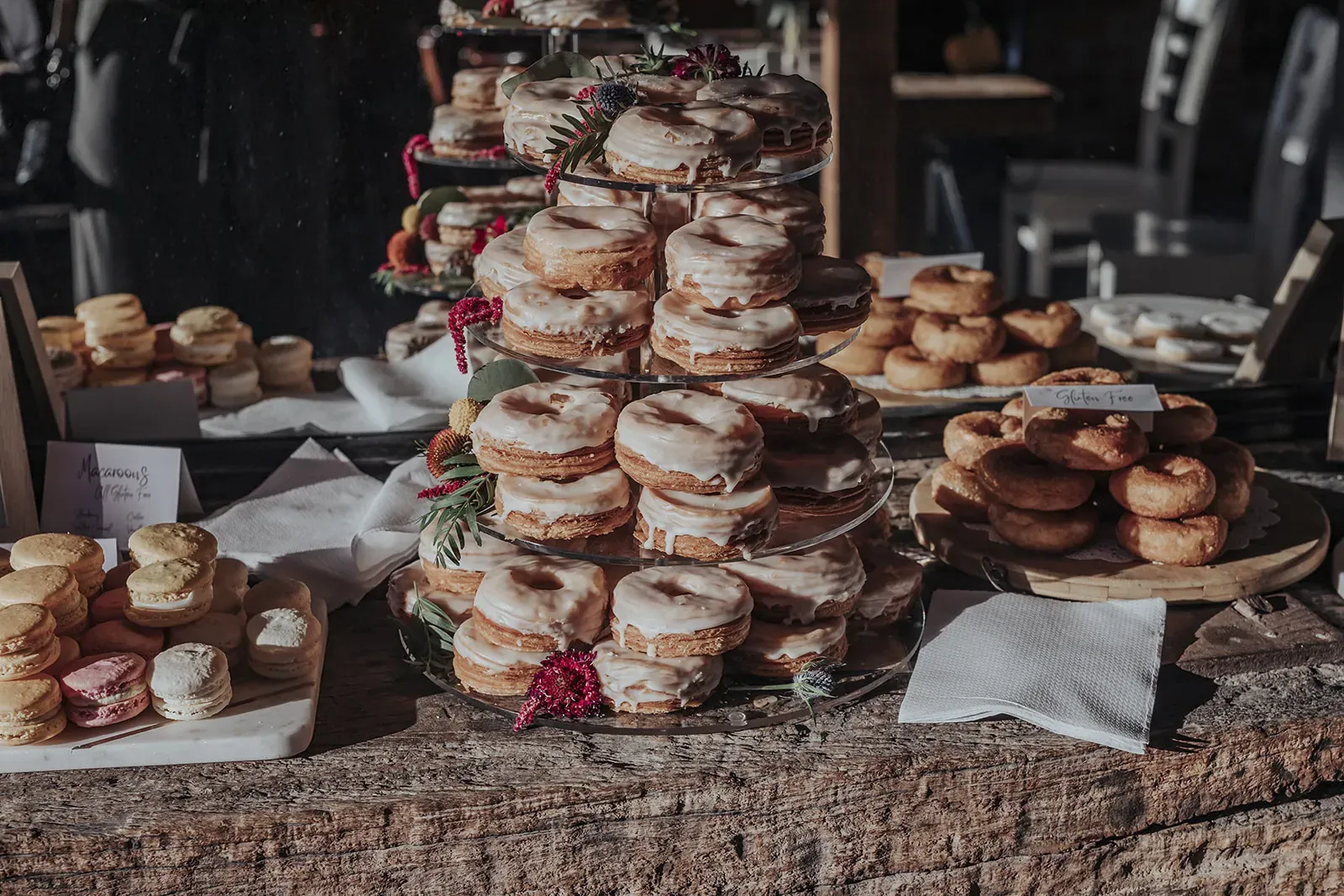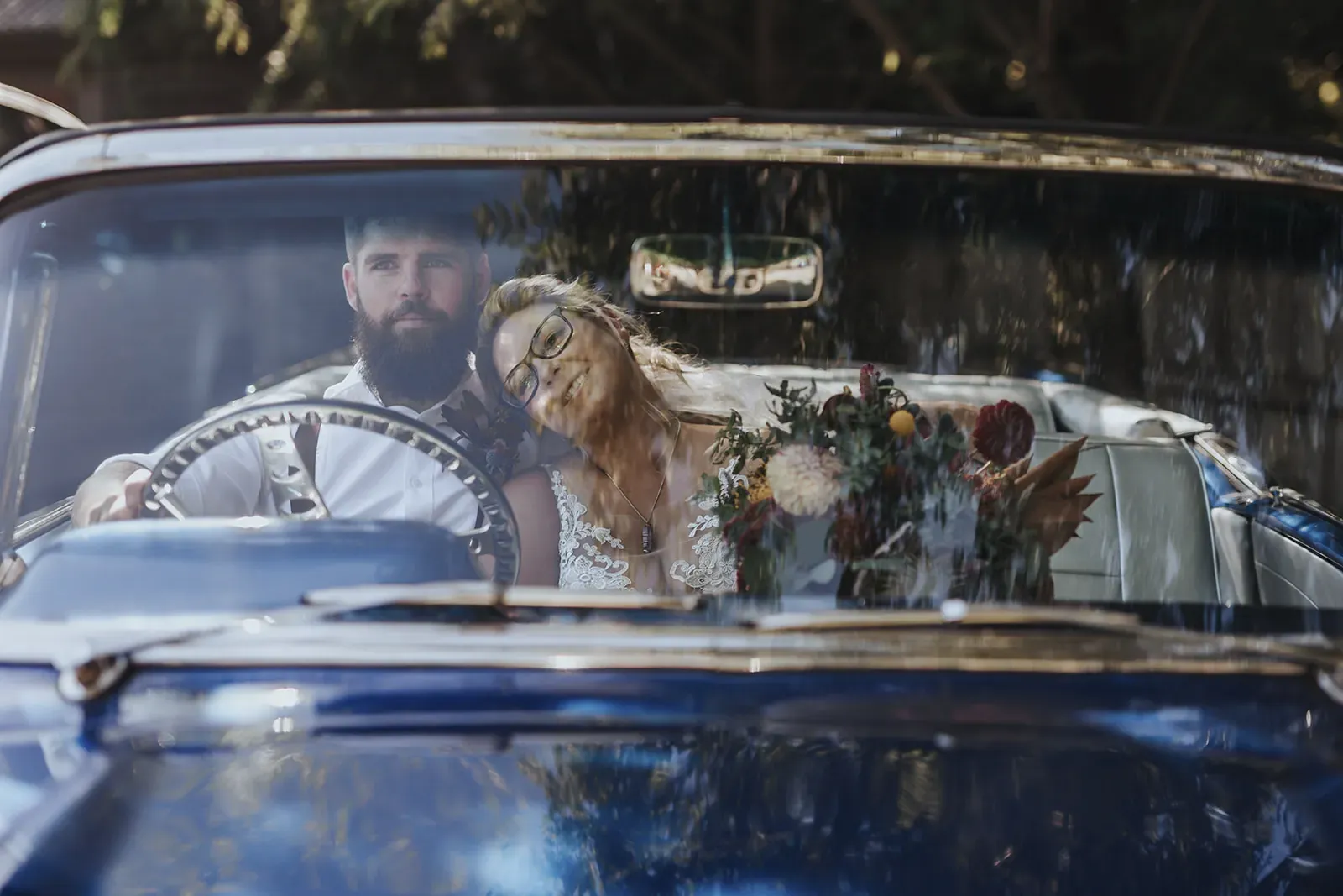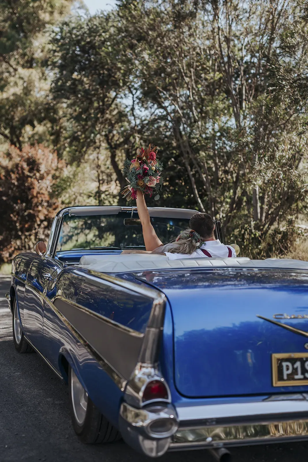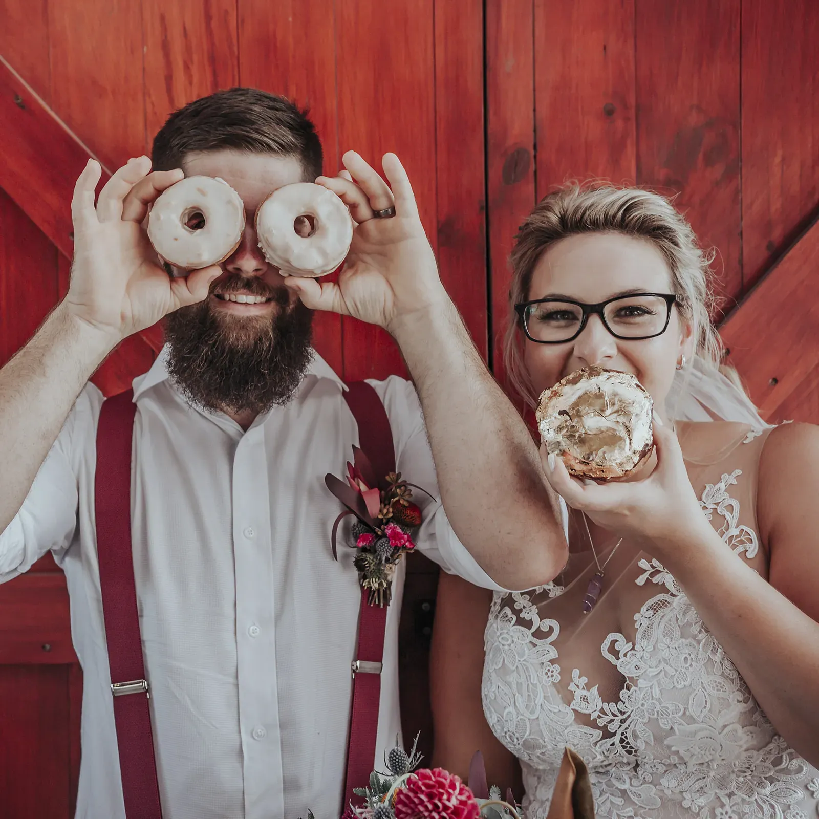 Angela’s timeless lace gown paired with a bold bouquet of rich florals was a romantic highlight, while Chris kept things cool in khaki trousers, suspenders, and a crisp white shirt. A DIY donut tower, quirky photo displays, and signage made the day feel personal. And that vintage car? It wasn’t just transport, it became part of the story.