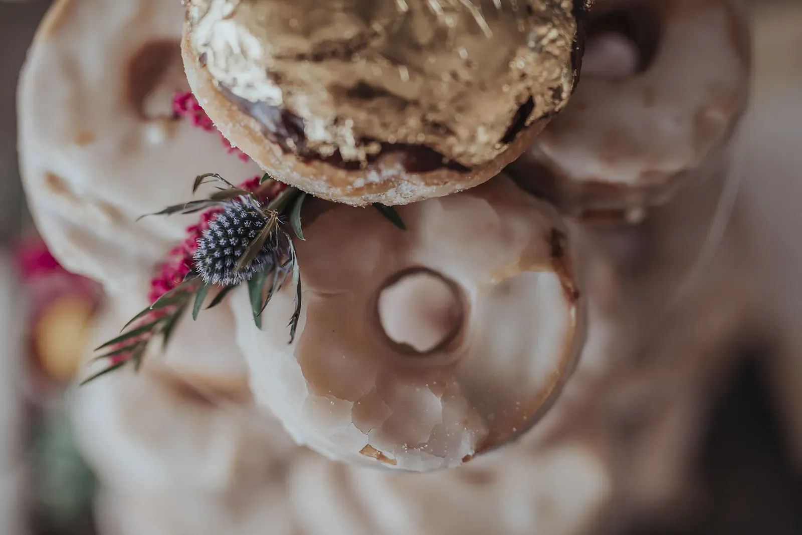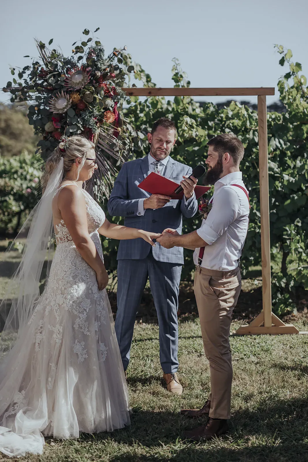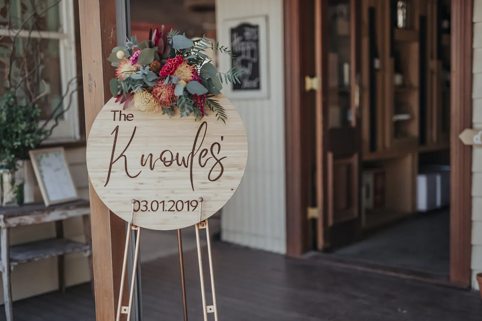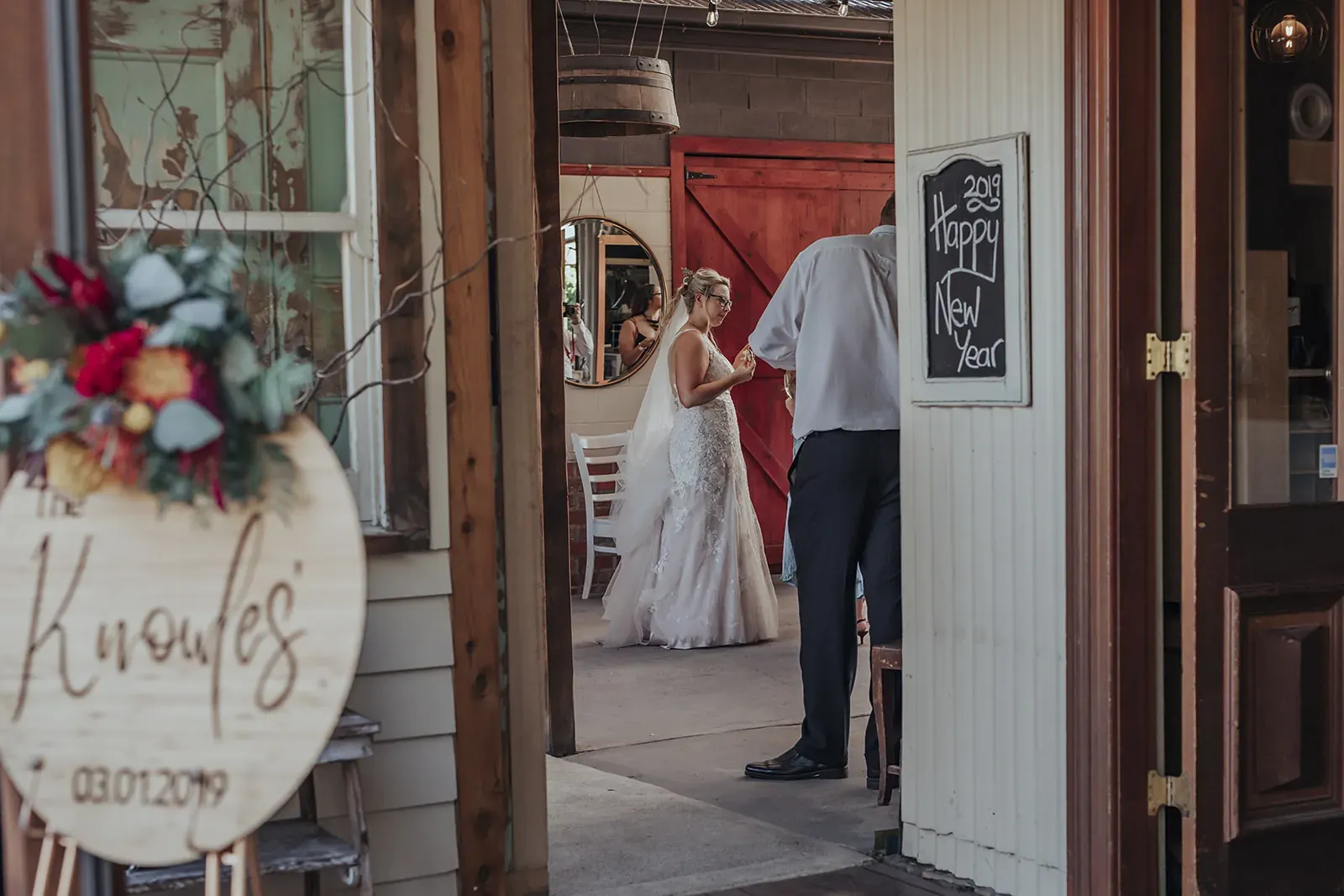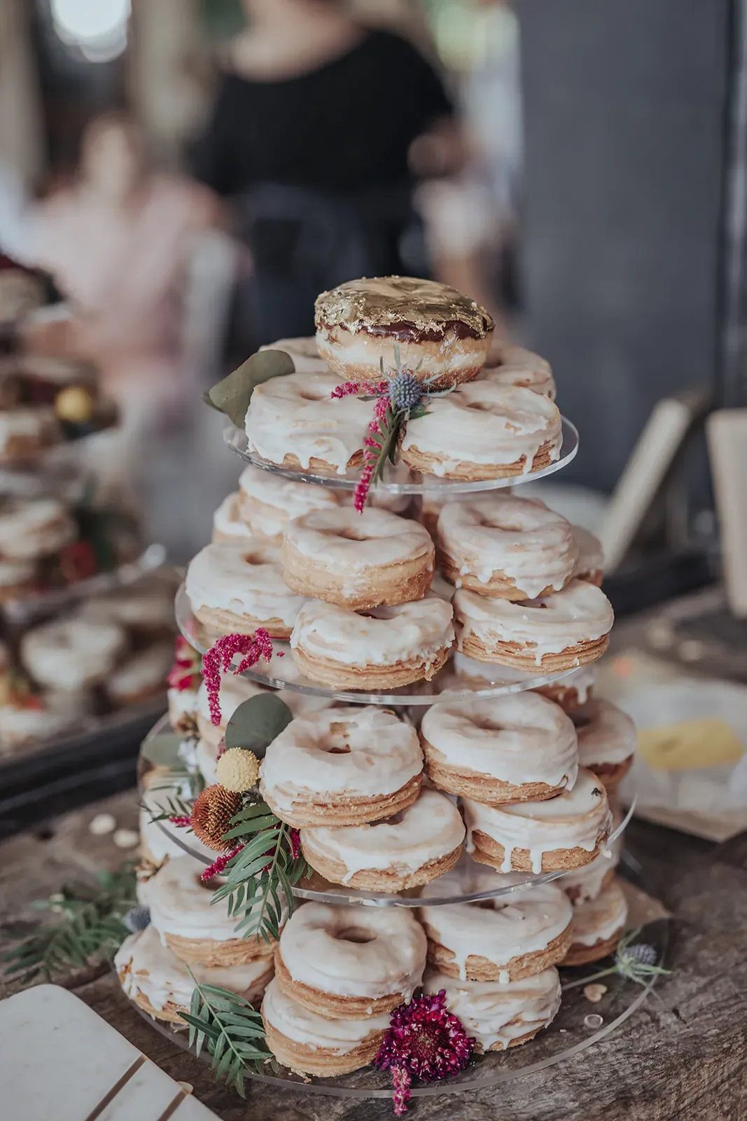 Angela’s timeless lace gown paired with a bold bouquet of rich florals was a romantic highlight, while Chris kept things cool in khaki trousers, suspenders, and a crisp white shirt. A DIY donut tower, quirky photo displays, and signage made the day feel personal. And that vintage car? It wasn’t just transport, it became part of the story.